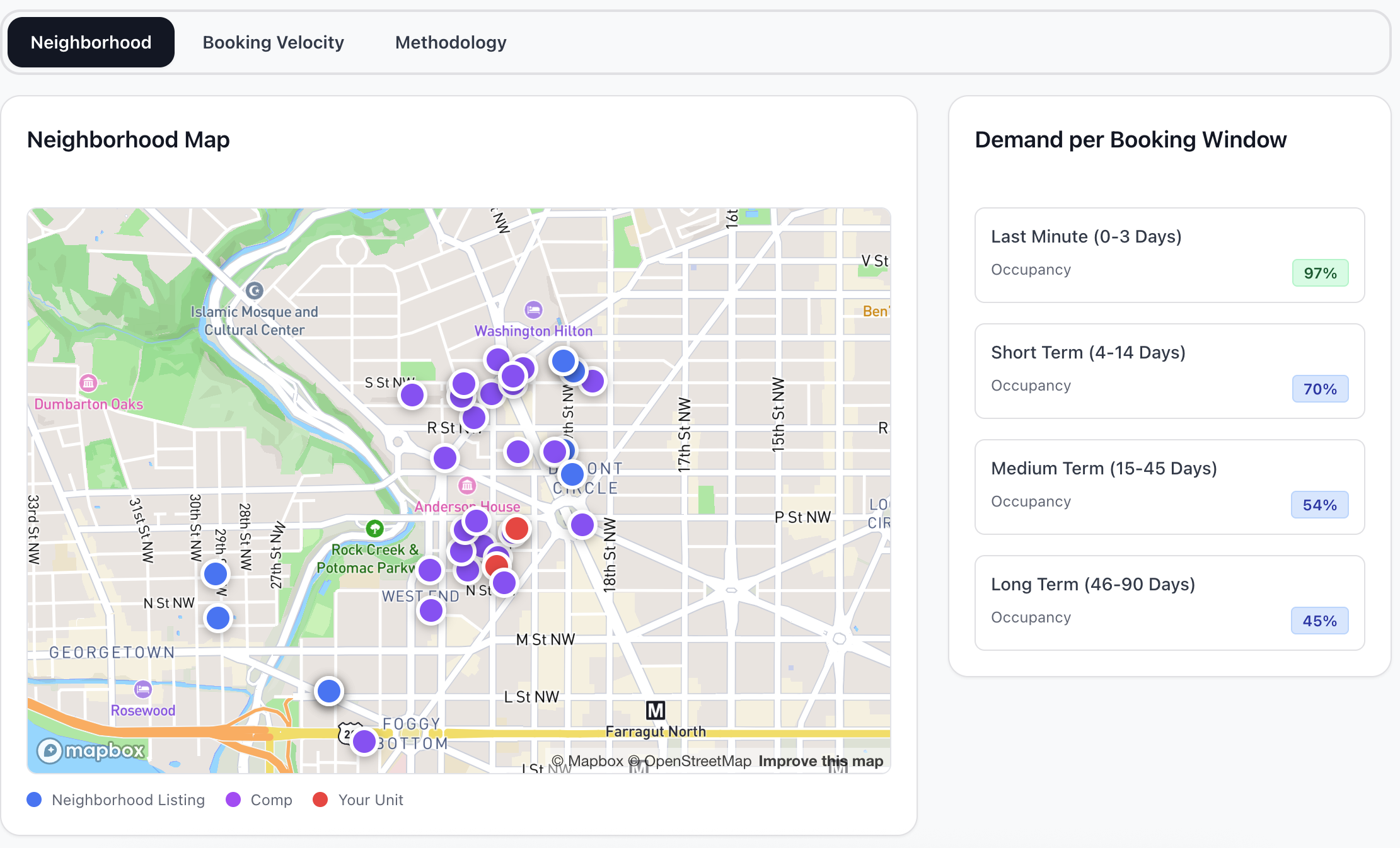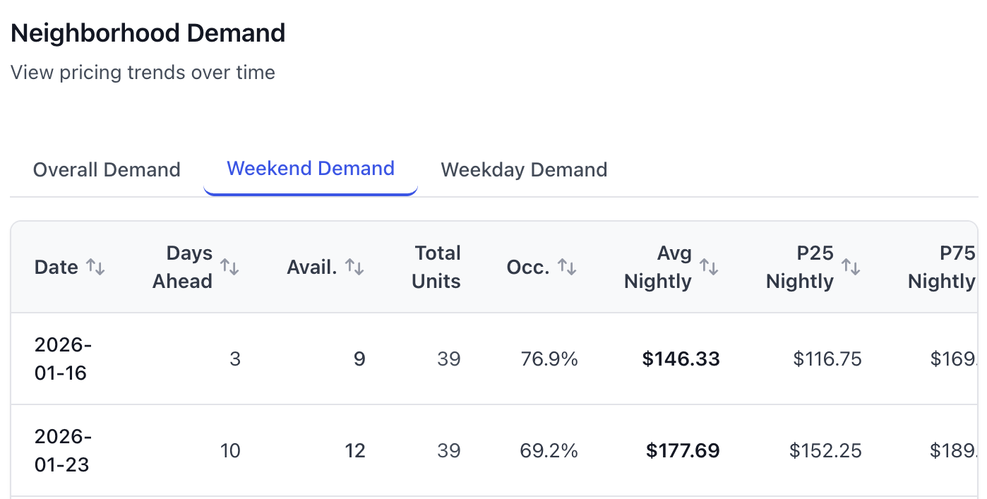 See low, mid, and high price ranges for your neighborhood across all dates. Understand which dates support premium pricing and which don't.