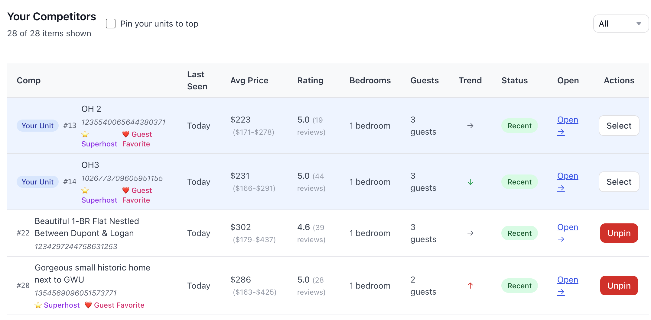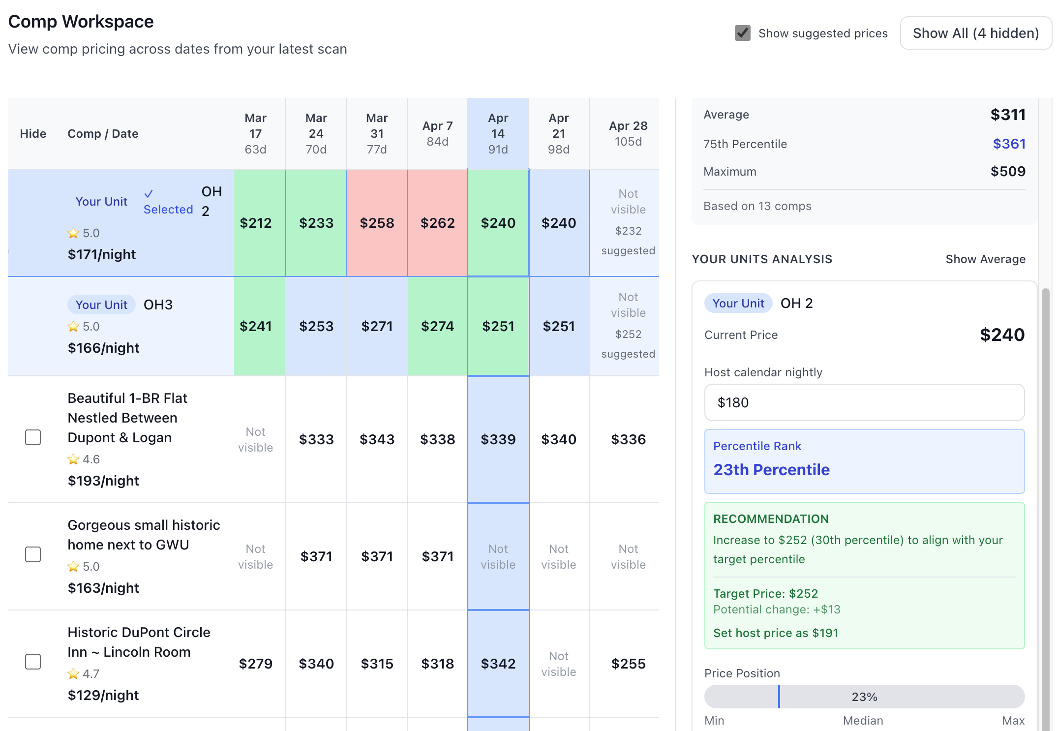 See comp pricing across future dates, then click any date to instantly view price ranges, see where your units rank against the competition, and get suggested prices to be in line with the competition.